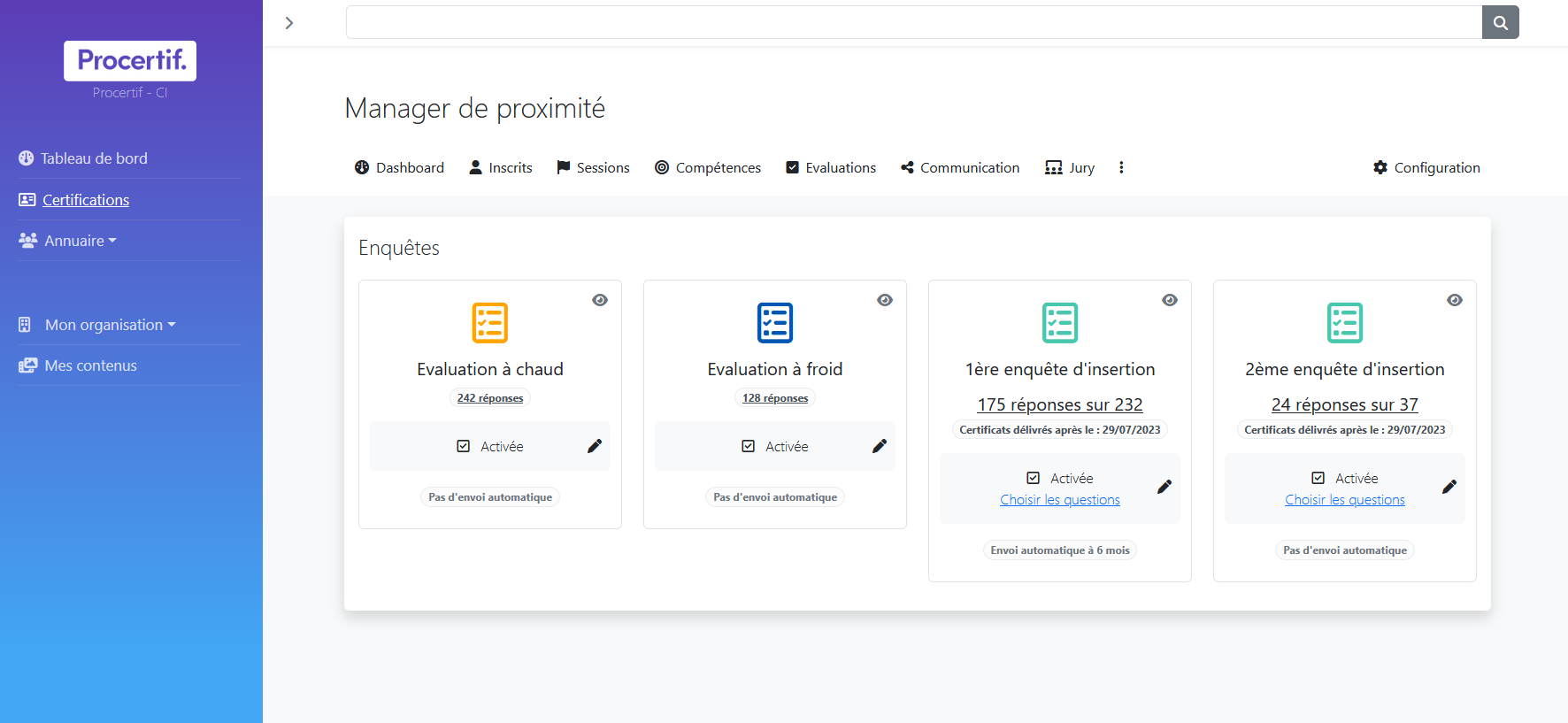L’enquête d’insertion est automatisée dans votre parcours de certification, vous permettant de collecter et d’analyser les bons indicateurs sans effort supplémentaire.