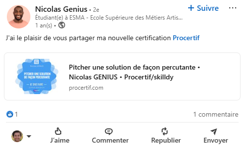 Grâce à Procertif, vos certifiés deviennent vos meilleurs ambassadeurs. En un clic, ils partagent leur parchemin numérique sur les réseaux sociaux, valorisent leurs compétences… et boostent la visibilité de votre certification auprès d’un large public.