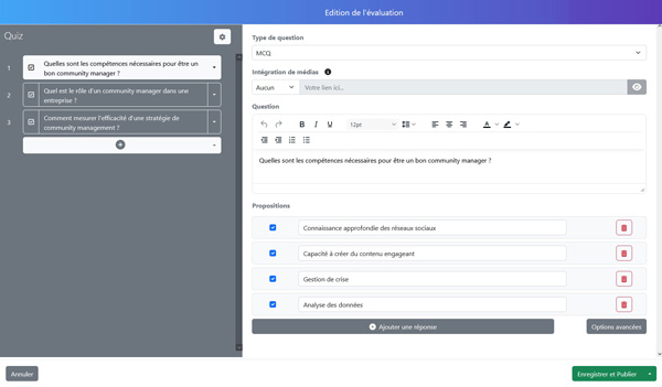 QCM, QCU, réponse libre, vidéo, médias… Vous disposez d’un large choix d’activités pour mesurer les compétences de vos futurs certifiés.